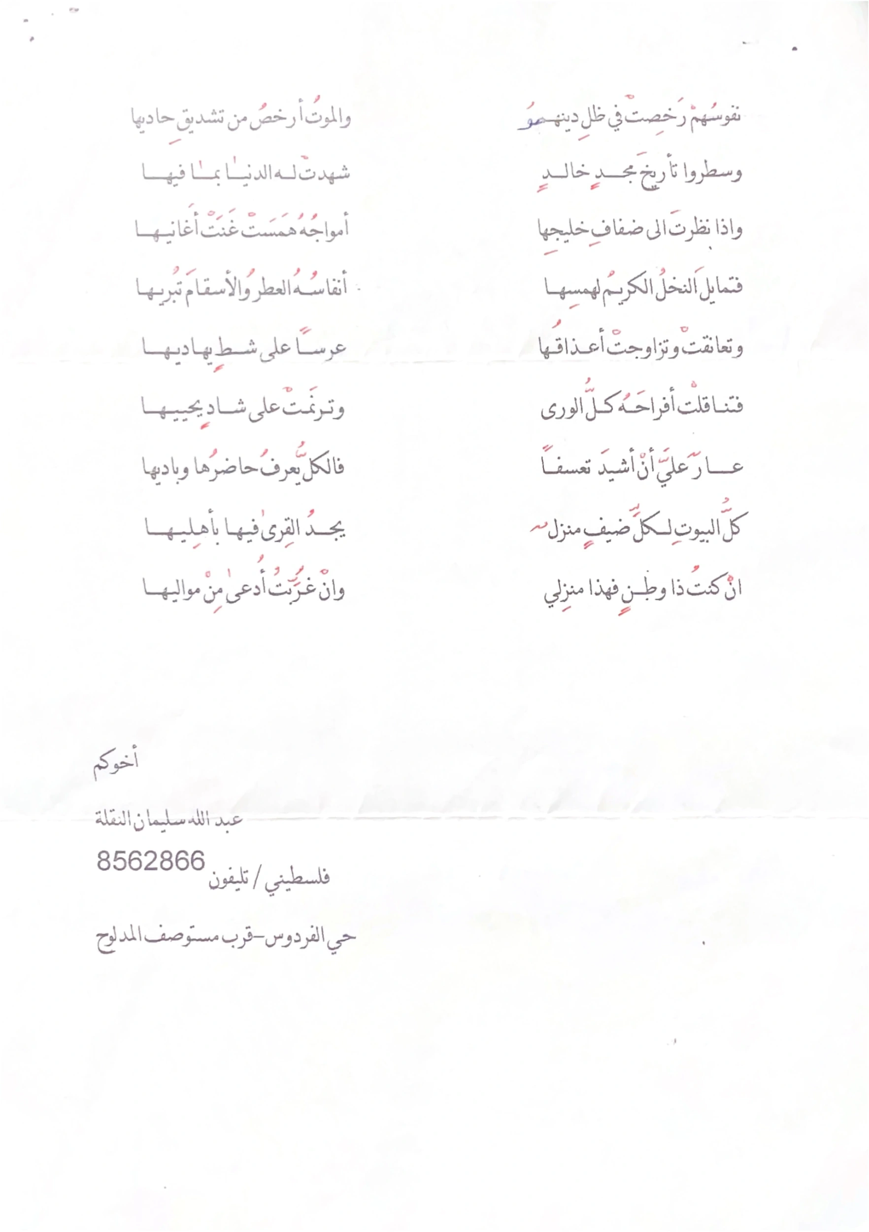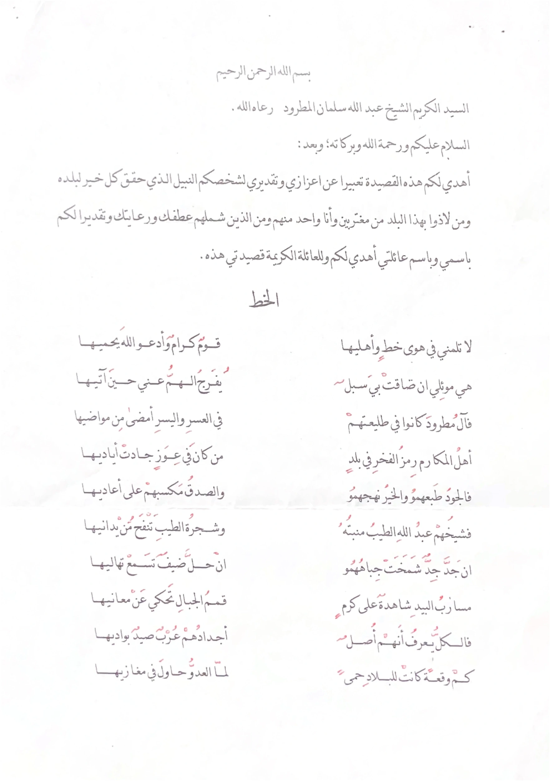 أهدي لكم هذه القصيدة تعبيرا عن اعزازي وتقديري لشخصكم النبيل الذي حقق كل خير لبلده ومن لاذوا بهذا البلد من مغتربين وأنا واحد منهم ومن الذين شملهم عطفك ورعايتك وتقديرا لكم باسمي وباسم عائلتي أهدي لكم وللعائلة الكريمة قصيدتي هذه.