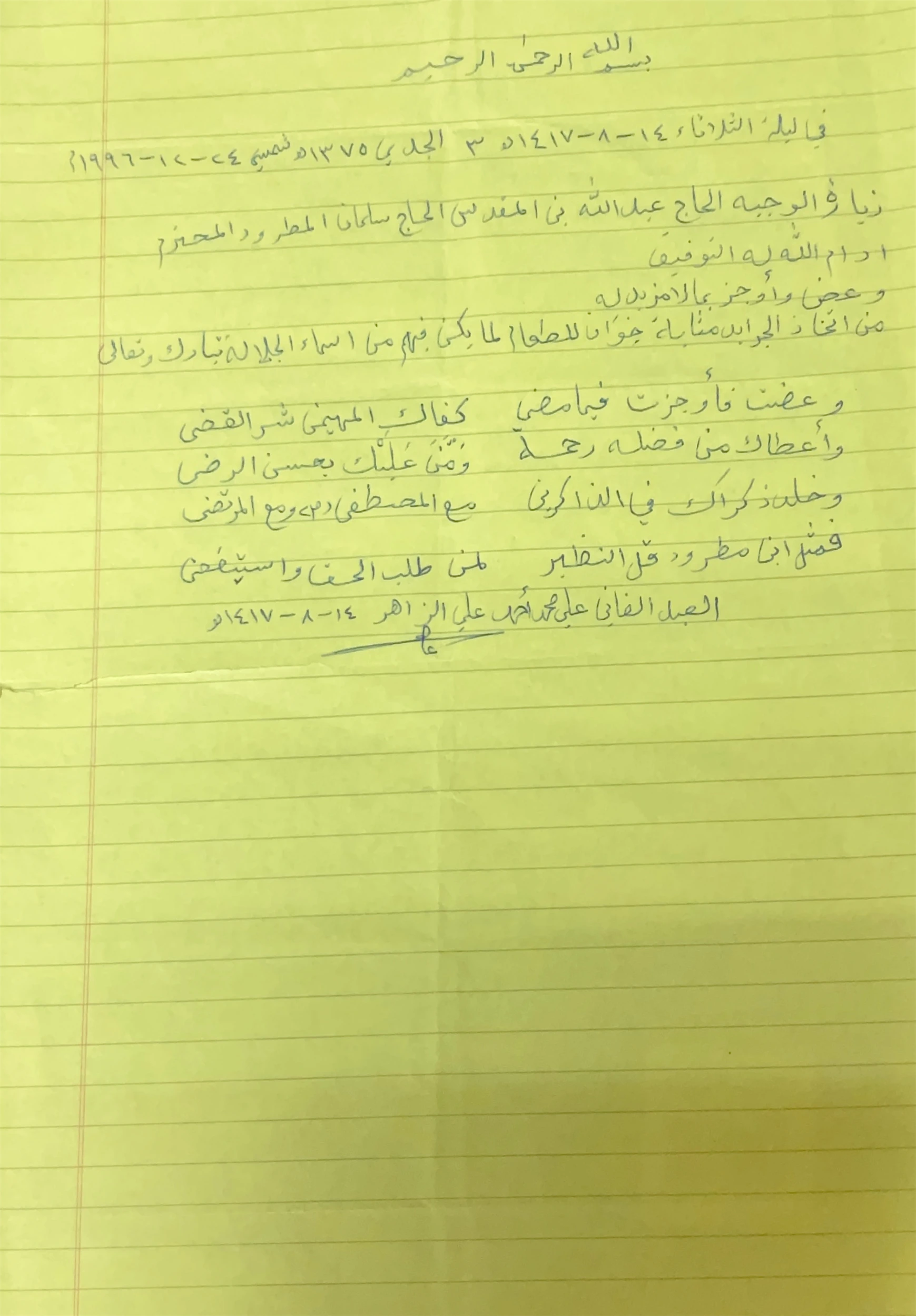 في ليلة الثلاثاء ١٤/٠٨/١٤١٧هـ ٣ الجدي ١٣٧٥هـ شمسي ٢٤/١٢/١٩٩٦م