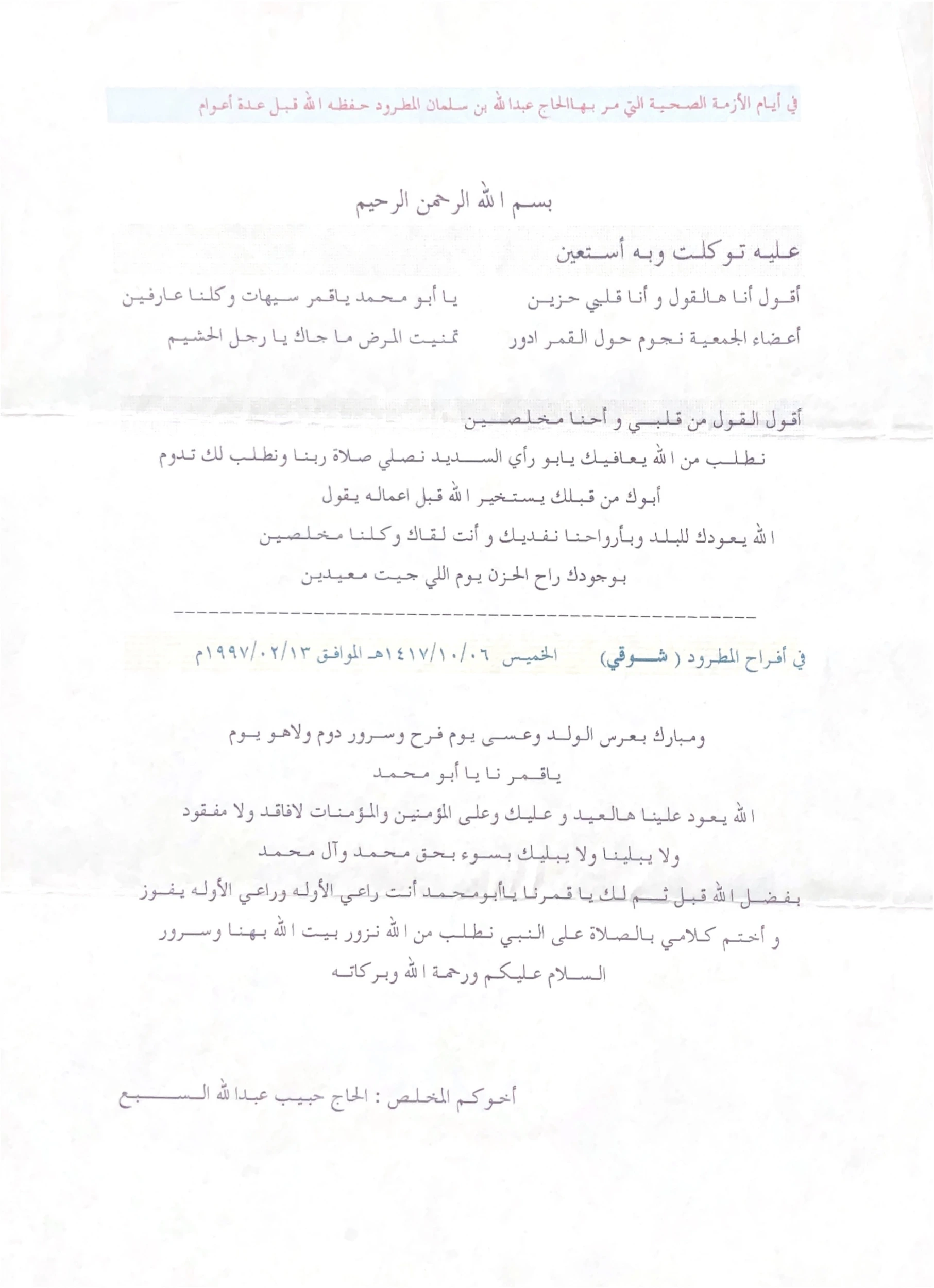 في أيام الأزمة الصحية التي مر بها الحاج عبد الله بن سلمان المطرود حفظه الله قبل عدة أعوام